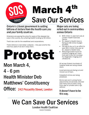 40 million in cuts coming to hospitals in London Ontario and 3 billion coming province wide. Join us at the health minister's office at 242 Piccadilly st. Monday Mar 4 at 4pm for some street theatre (musical beds and chairs) and help us Save our Services. All welcome!