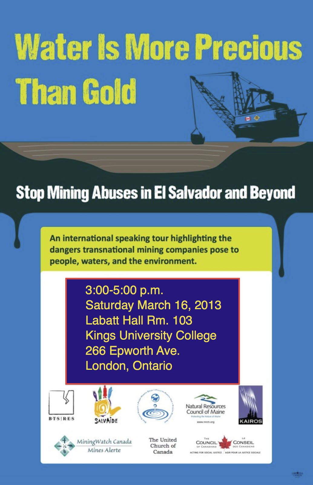 "With the support from organizations like the Council of Canadians, Mining Watch Canada, KAIROS, The United Church of Canada, The Natural Resources [Council] of Maine, B.T.S., and SALVaide among others, Salvadoran Activists will be speaking on the Negative Impact the Canadian Mining Industry has in El Salvador and other Latin American nations.